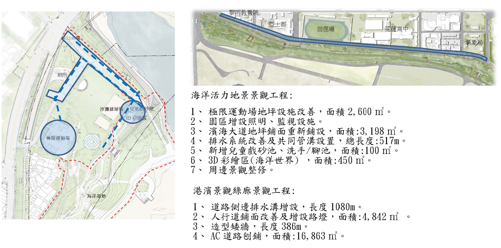 本工程係為改善北濱公園(含極限運動場)、193縣道海岸路(自黎明教養院起至花蓮氣象雷達站文復路止區間)之舖面、排水、照明與綠化景觀等設施,另修繕兩潭自行車道南、北節點之景觀平台。