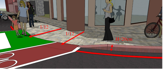 應平順且地面高度不宜大於20公分,位於商業行為集中區域,降低路緣石高度以免商家因進、卸貨需要而自行墊設斜坡道。
