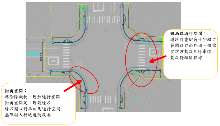 在十字路口的行人斑馬線通行空間,斑馬線的畫設需明確對到往返街角的無障礙人行坡道,並且與 道路方向調整斑馬線劃設角度,路線與標線要整齊、水平。