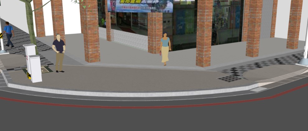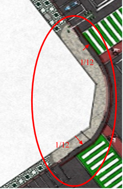- 路緣斜坡應配合無障礙通路之動線與行人穿越位置設置。
