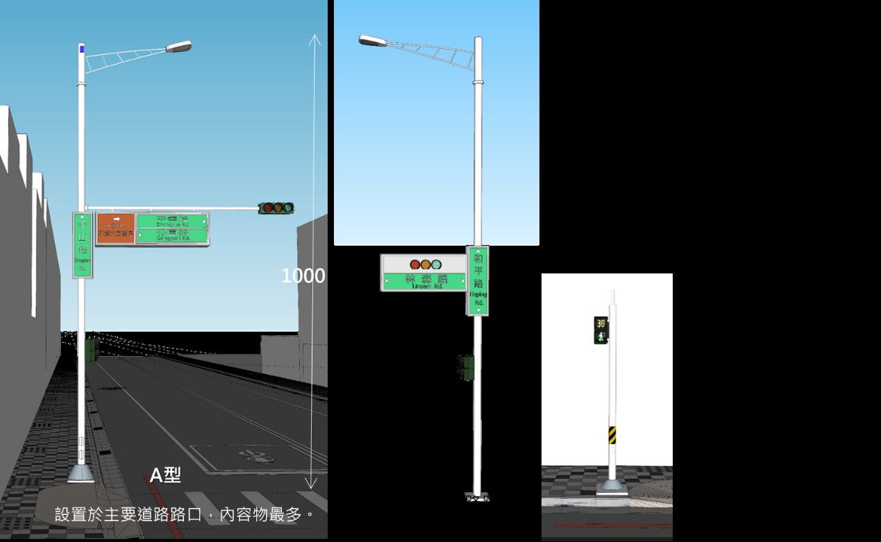 - 型設置於次要道路路口,整合交通號誌燈,高10公尺,設施與路名牌等數量次之。