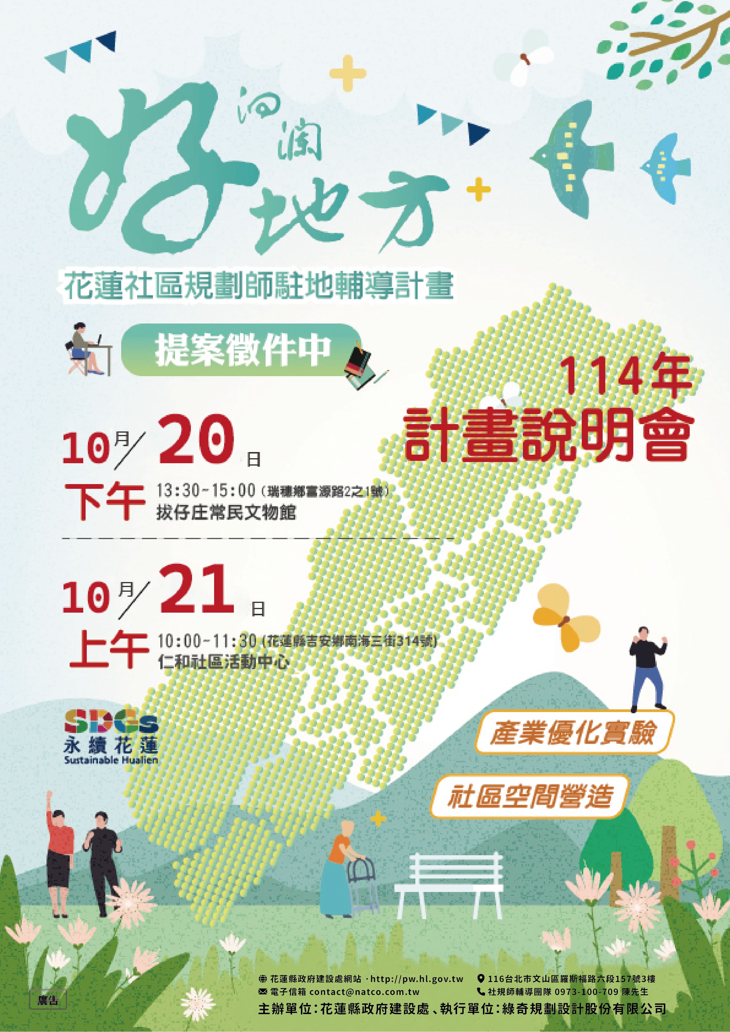 114年度花蓮縣社區規劃師提案計畫徵選活動正式啟動,歡迎大家熱情參與。