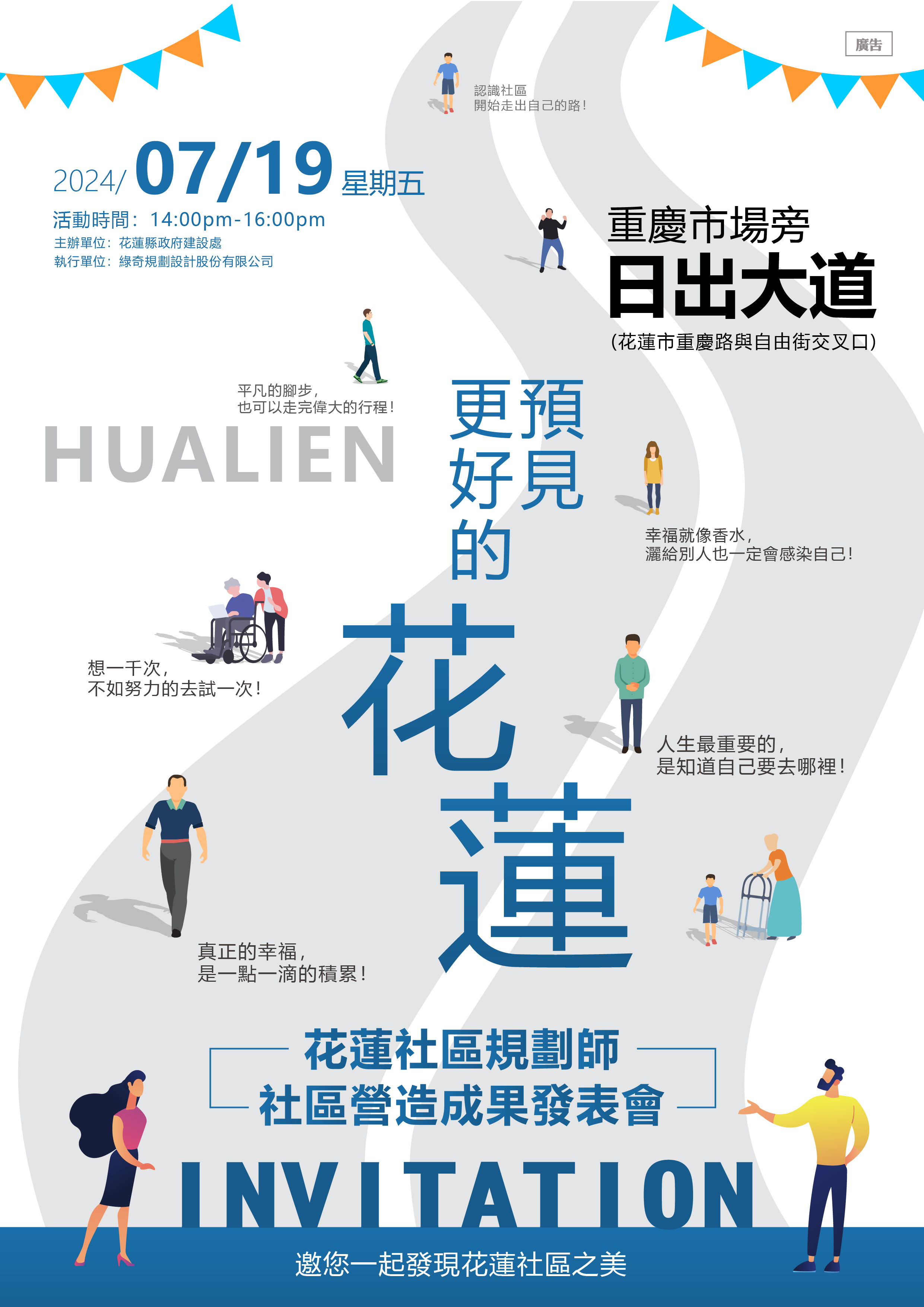 花蓮縣政府訂於民國113年7月19日(星期五)下午2點假日出大道(重慶路旁)辦理112年度花蓮縣社區規劃師成果發表暨園遊會,從規劃設計、提案競賽、僱工購料、民眾參與到實作完成,24組社區將熱情展現的一年來努力營造的精彩成果,讓所有縣民感受社區規劃師輔導「社區製作•在地直營」的親切溫度和豐富底蘊,共同見證花蓮社規師扎根地方與社區一同營造社區優質風貌與特色。