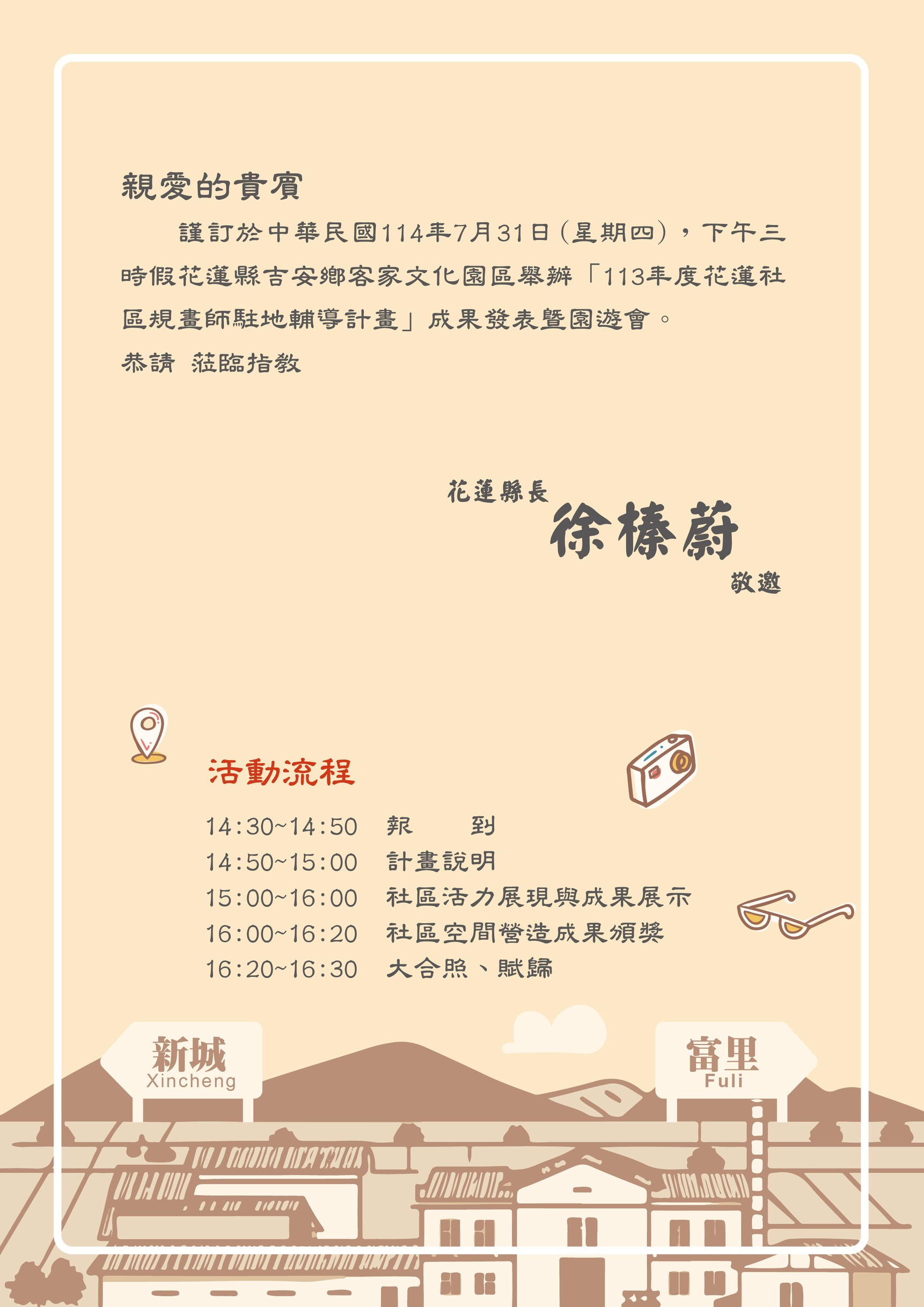 花蓮縣政府訂於民國114年7月31日(星期四)下午3點整假「客家文化園區」(花蓮縣吉安鄉中正路二段60號)辦理113年度花蓮縣社區規劃師成果發表暨園遊會,從規劃設計、提案競賽、僱工購料、民眾參與到實作完成,21組社區將熱情展現的一年來努力營造的精彩成果,讓所有縣民感受社區規劃師輔導「社區手作•在地直營」的親切溫度和豐富底蘊,共同見證花蓮社規師扎根地方與社區一同營造社區優質風貌與特色。